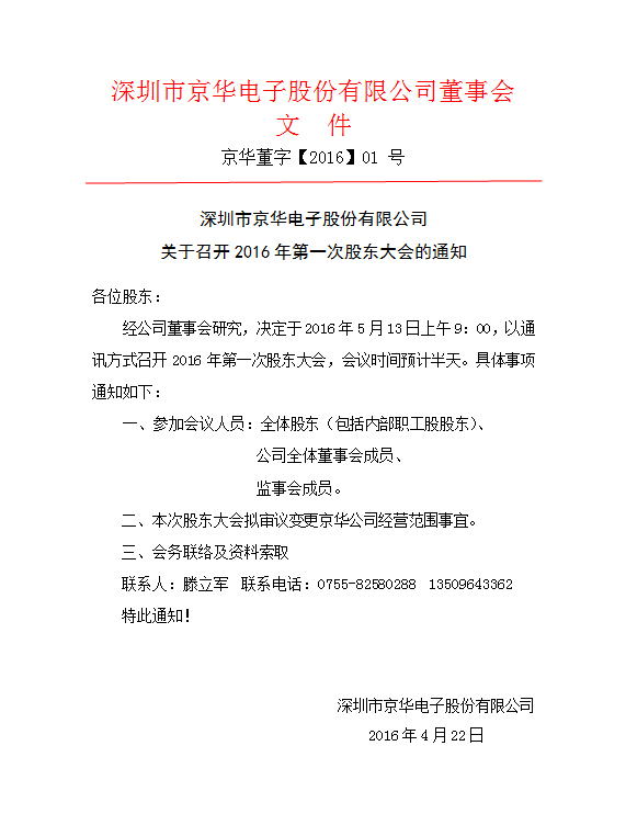 深圳市金年会网站net電子股份有限公司關於召開2016年第一次股東大會的通知